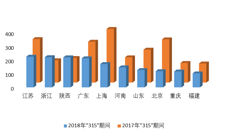 從地區(qū)受理量來看,和近兩年“3·15”期間平臺受理數據對比發(fā)現,江蘇、上海、北京和廣東等地受理量均較去年同期下降明顯,浙江、陜西、河北和四川等地受理量均較去年有所增長。