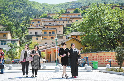 圖為游客在東安村村前文化廣場游覽。