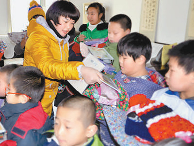| 志愿者康雅靜在為貧困學(xué)生們發(fā)放書本。 |