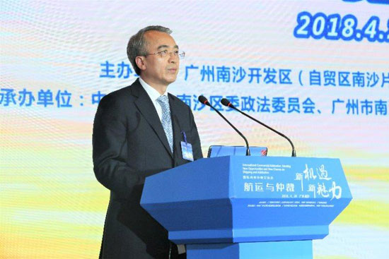 在“航運(yùn)與仲裁 新機(jī)遇 新魅力”國際仲裁交流活動(dòng)上,廣州市委常委、南沙區(qū)委書記蔡朝林致辭推介南沙。