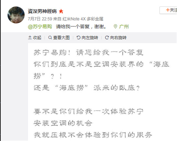 “蘇寧易購!請您給我一個答復(fù),你們到底是不是空調(diào)安裝界的海底撈”。眾所周知,海底撈因其超乎想象的貼心服務(wù)在餐飲界一枝獨秀,廣州體驗官蔡先生以海底撈作比,“怒贊”他的體驗行程。