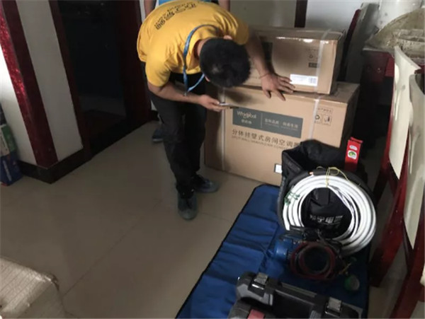 拆包裝前請業(yè)主核對發(fā)票以防貨不對版,拆包裝后再請業(yè)主確認(rèn)無磕碰損壞,驗貨后方可進入安裝環(huán)節(jié)。24樓無護欄的平臺,外機安裝師傅綁好安全繩就出去,還要在不足2平米的小平臺上心無旁騖地作業(yè),“光看著就讓人驚心動魄”。