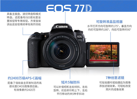 最后,不得不提的佳能77D,雙套對(duì)焦系統(tǒng)的高性能單反機(jī),攝影愛(ài)好者的新選擇,專(zhuān)業(yè)的操作系統(tǒng)實(shí)用便捷的相機(jī)設(shè)計(jì),雙核自動(dòng)對(duì)焦5軸防抖,內(nèi)置WiFi/NFC/藍(lán)牙,照片及時(shí)分享,兼顧了便攜的體積與專(zhuān)業(yè)的操控,同時(shí)在機(jī)身性能上也有著不俗的配置。而在畫(huà)質(zhì)、控噪方面,77D同樣有著良好的表現(xiàn)。