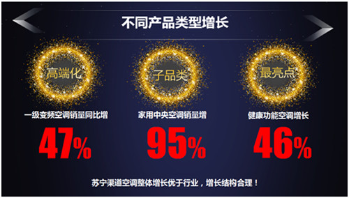 蘇寧易購大數(shù)據(jù)平臺顯示,產(chǎn)品結(jié)構(gòu)變化的方向有三:一、高端化趨勢如一級變頻空調(diào)銷量同比增47%;其二、以家用中央空調(diào)為代表的子品類銷量增長95%;其三、功能趨勢最大亮點,健康功能空調(diào)增長46%。