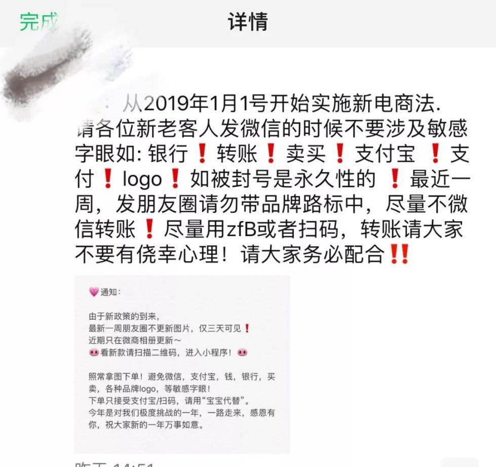 新《電商法》雖然沒有對微商、個人代購的監(jiān)管沒有出具體細則,代購圈內卻已流傳了多個監(jiān)管措施版本,比如“敏感字眼交易雙方封號”、“不能微信直接付款”、“朋友圈限流和降權”等。
