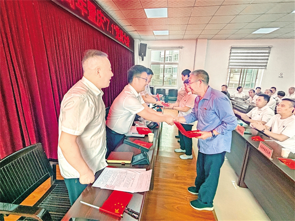 6月26日上午,嵐皋縣城關(guān)鎮(zhèn)西坡社區(qū)黨組織為黨齡滿50年的3名老黨員頒發(fā)“光榮在黨50年”紀(jì)念章,給每名參會黨員送上“政治生日賀卡”。魏代續(xù) 廖霖 攝