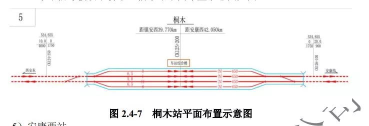 車站初始規(guī)3臺(tái)8線布置,遠(yuǎn)期隨天水一十堰鐵路引入預(yù)留1臺(tái)2線(PS:另一條高鐵過境安康,美),總規(guī)模4臺(tái)10線。到發(fā)線有效長(zhǎng)650m,設(shè)島式站臺(tái)(450×12×1.25m)4座,設(shè)旅客進(jìn)出站地道2座(寬12m)。