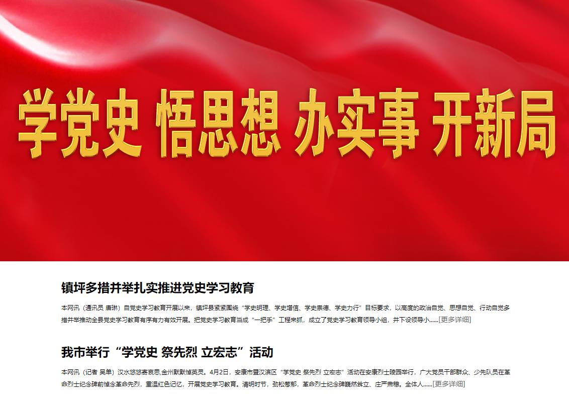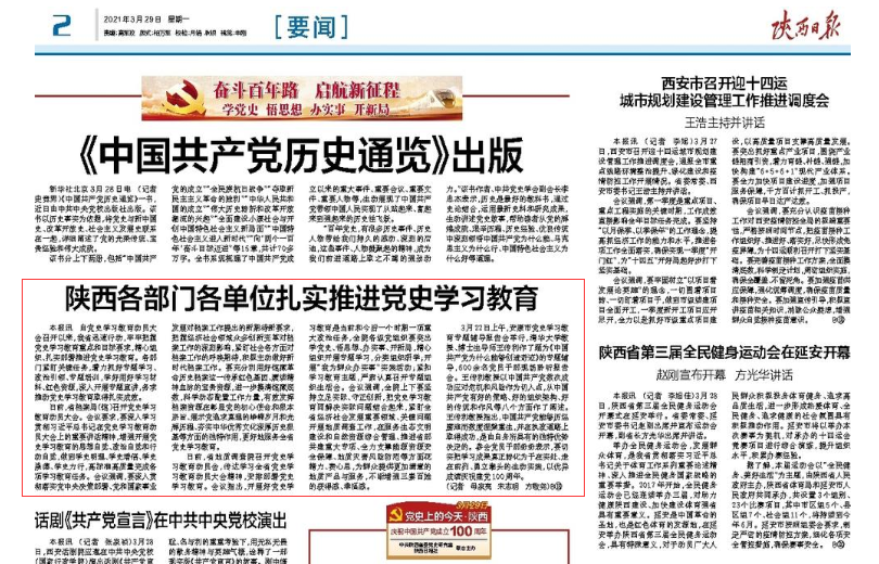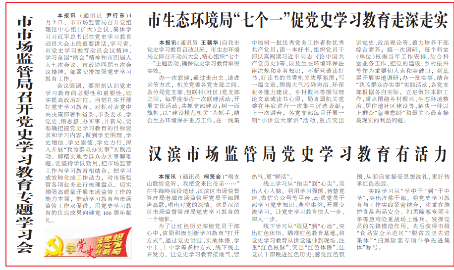 《安康日報》在及時轉(zhuǎn)載新華社關(guān)于中央開展黨史學(xué)習(xí)教育有關(guān)活動的同時,主動跟進報道我市黨史學(xué)習(xí)教育系列安排部署!栋部等請蟆芳皶r開設(shè)“學(xué)黨史 悟思想 辦實事 開新局”專欄,刊發(fā)全市黨史學(xué)習(xí)教育動態(tài)。截至目前,《安康日報》和安康新聞網(wǎng)開設(shè)“黨史上的今天”、“慶祝中國共產(chǎn)黨成立100周年”、“學(xué)黨史、悟思想、辦實事、開新局”、“奮斗百年路 啟航新征程”等報紙和網(wǎng)站及微信公眾號、視頻號專欄6個,刊發(fā)全市黨史學(xué)習(xí)教育動態(tài)報道和理論文章300余篇,其中《習(xí)近平總書記黨史學(xué)習(xí)教育動員大會上的重要講話在我市引起熱烈反響》《黨員干部心中植下“三棵樹” 》《在學(xué)黨史中增強“三力”》等一批稿件產(chǎn)生積極影響。
