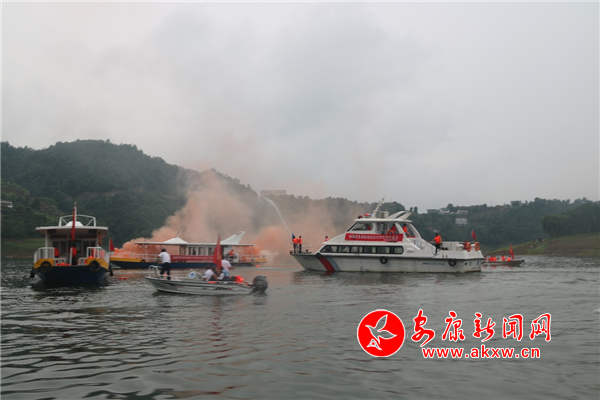 雨中的瀛湖碧水粼粼,四周山嵐氤氳繚繞。上午九時,演習(xí)活動冒雨開始,劉建平在致辭中闡釋了本次演習(xí)的重要意義,感謝省上領(lǐng)導(dǎo)專家蒞臨指導(dǎo),強(qiáng)調(diào)要不斷完善強(qiáng)化水上應(yīng)急措施,確保賽事圓滿進(jìn)行,并預(yù)祝演習(xí)圓滿成功。隨即包括應(yīng)急響應(yīng)、水上綜合演練(包含搜救打撈、消防滅火、傷員救治、遇險船拖)、水上防風(fēng)預(yù)警演練、游泳賽場運(yùn)動員救援四部分演練正式拉開帷幕。首先是應(yīng)急響應(yīng),各救援分隊向指定地點(diǎn)集結(jié)并檢查報告救援船艇、設(shè)備、人員到位情況,總指揮下達(dá)演習(xí)開始指令。緊接著是水上綜合演練,只見翠屏島南側(cè)寬闊的湖面上,兩艘東西方向相向而行的客船發(fā)生“碰撞,一艘起火,有人員落水”,接到救援信息后,現(xiàn)場總指揮向瀛湖海事局下達(dá)救援指令,執(zhí)行組長分別向海事、景區(qū)公安、交運(yùn)公司等救援隊發(fā)出指令,十?dāng)?shù)艘救援船只接到命令后迅速趕赴事發(fā)現(xiàn)場,在湖面掀起了層層的浪花,有的負(fù)責(zé)事故水域交通管制、碼頭及救援現(xiàn)場秩序維護(hù),有的負(fù)責(zé)事故船只消防滅火、定點(diǎn)?考巴蠋ё鳂I(yè),有的負(fù)責(zé)水域搜尋救撈、旅客轉(zhuǎn)移……現(xiàn)場氣氛緊張、忙而不亂,打撈搜救任務(wù)成功完成,火情得到有效控制,失去動力的遇險船舶被拖帶至安全地點(diǎn),3名“溺水昏迷人員”成功實(shí)施現(xiàn)場急救(心肺復(fù)蘇)并轉(zhuǎn)移至岸上醫(yī)療救助點(diǎn)實(shí)施救治。隨后是水上防風(fēng)預(yù)警演練,模擬瀛湖核心景區(qū)局部水域突起大風(fēng)威脅船舶航行安全,海事局立即發(fā)布禁航通知,組織在航船舶及乘客就近?勘茈U。最后是游泳賽場運(yùn)動員救援,“游泳賽事中突然有1名運(yùn)動員出現(xiàn)身體不適需要救援”,接到救援信號后,水上應(yīng)急隊伍迅速駕駛執(zhí)法沖鋒舟趕到事發(fā)水域,對運(yùn)動員進(jìn)行施救并轉(zhuǎn)運(yùn)至醫(yī)療點(diǎn)。