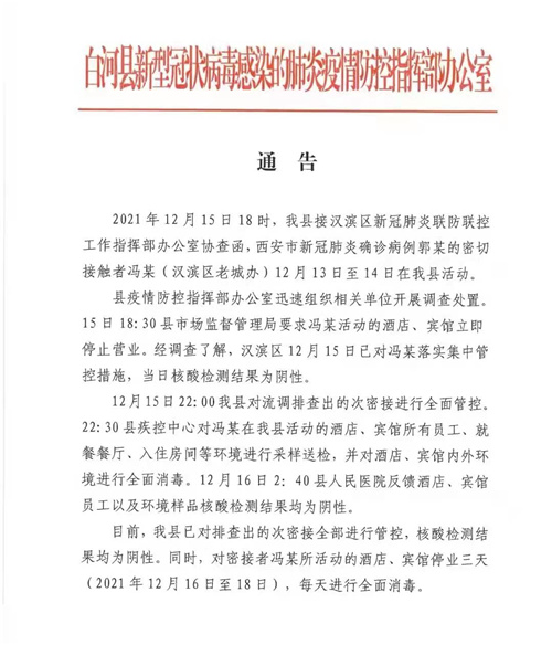 縣疫情防控指揮部辦公室迅速組織相關(guān)單位開展調(diào)查處置。15日18:30縣市場監(jiān)督管理局要求馮某活動(dòng)的酒店、賓館立即停止?fàn)I業(yè)。經(jīng)調(diào)查了解,漢濱區(qū)12月15日已對馮某落實(shí)集中管控措施,當(dāng)目核酸檢測結(jié)果為陰性。