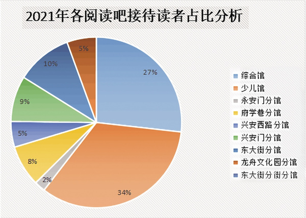 2021年,市圖書館(含各閱讀吧)共接待讀者437169人次,日均接待讀者達(dá)到1197人次。閱讀吧共計接待讀者172994人次,占全年接待讀者總?cè)藬?shù)的39%。數(shù)據(jù)表明,市圖書館正逐步成為市民閱讀、學(xué)習(xí)、交流、休閑的重要場所。安康閱讀吧在為讀者提供便捷閱讀的同時,節(jié)約了時間成本,加快了書香安康的建設(shè)步伐。