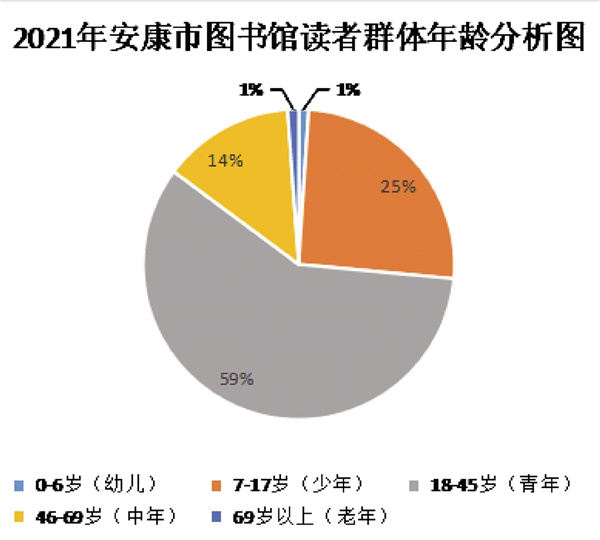 從讀者年齡段來看,市圖書館2021年有幼兒讀者(0-6歲)324人,少兒讀者(7-17歲)8098人,青年讀者(18-45歲)18686人,中年讀者(45-69歲)4347人,老年讀者(69歲以上)366人。讀者群體中青年讀者占比最大,占讀者群體的59%。少年讀者和青年讀者仍是圖書館的主要服務(wù)對象,總占比達(dá)到84%。