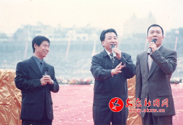 2002年,第三屆安康龍舟節(jié)上,姜昆、戴志誠、金維潤為觀眾帶來群口相聲《歡迎您到安康來》。 趙方 攝