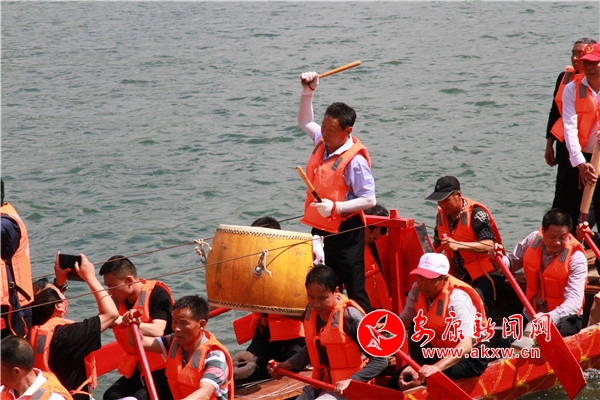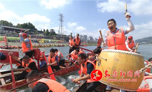 上午10時許,龍舟文化園禮炮轟鳴,數(shù)百健兒痛快地飲下“摔碗酒”,隨后依次登上自己隊伍的龍舟。紅色、黃色、紫色的龍舟整齊劃一地停靠在江邊,龍頭高昂,龍尾高翹,槳櫓浮動,旗幟飄揚。聞聲而來的群眾齊聚兩岸,駐足圍觀?傊笓]一聲哨響,木槳齊動,龍舟似箭掠過無垠江面直逼江心,留下層層白浪;一艘艘或逆流勇進,或順流而下,或徑直橫渡,瞬間點燃觀眾激情,不時引得大家齊聲吶喊。號子聲、鑼鼓聲、吶喊聲、歡呼聲,此起彼伏,聲聲震天。隊員們跟隨著鼓點賣力地劃槳,舵手隨著龍舟行進的方向不停調(diào)整把舵,龍舟的速度不斷加快,再快,更快。