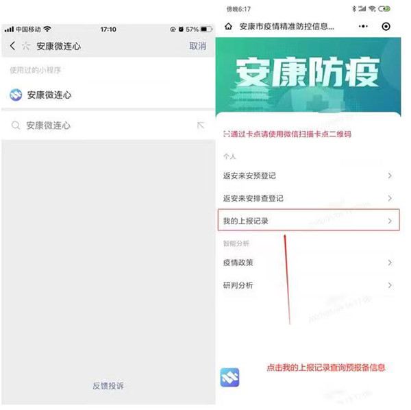 第三步,通過交通卡口,打開“安康微連心”微信小程序,點擊“安康防疫”,進入“我的上報記錄”,點擊“查看詳情”,點擊“我已抵達” 并掃描交通卡口“返安排查登記二維碼”確認(rèn)抵達。