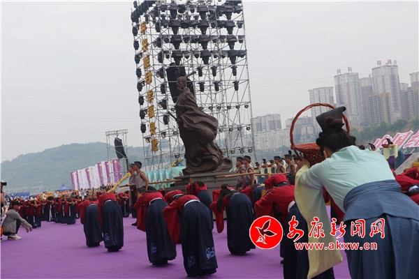 “緬懷先賢”隨著主祭官一聲令下,主題活動進入重要篇章。60名著青綠漢服女手持竹籃,伴著古琴的悠揚韻律款款走向舞臺,百名身著漢服、手持竹簡的兒童方陣緩緩步入舞臺,緊隨其后的愛國詩人屈原塑像在全場目光的注視下,被9位壯漢護送至舞臺正中。在主祭官的引導下,大家集體面向屈原像,百名兒童方陣齊誦祭文,清脆嘹亮的童聲如天籟般響徹云霄。“一鞠躬節(jié)分端午澤被安瀾;二鞠躬菖蒲酒美普惠蒼生;三鞠躬政善國興佑我中華。”緊接著,主祭官引導眾人向屈原塑像鞠躬叩首,漢服女分列兩隊,一邊把竹籃里面的粽子拋向江中,以示對先賢的敬畏與追思,一邊向臺上觀眾散發(fā)香包,以此將美好祝愿送給漢江兒女。