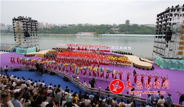 傳統(tǒng)儀式結(jié)束后,歌舞《打谷歡歌》、水岸表演《舞動漢江 活力安康》、民俗展演《向幸福出發(fā)》、新編漢劇《大美安康》、全新原創(chuàng)歌曲《端午最安康》相繼登臺,優(yōu)美的舞蹈配合婉轉(zhuǎn)唱腔,寓情于景,將傳統(tǒng)與現(xiàn)代、生活與藝術(shù)融合得恰到好處。期間還穿插進行了安康最富神采的經(jīng)典龍舟民俗項目——龍舟橫渡和搶鴨子、摸鯉魚。伴隨著震撼的鼓點聲,29支參賽龍舟隊伍的健兒們劈波斬浪,你追我趕,爭相抵達江岸。隨后,只見江面上水花飛濺,龍舟健兒們從龍舟上一躍而下,在湍急的江水中徒手捕捉浮游于江面的鴨子和鯉魚,勝利者將手中的魚兒與鴨子高高舉起,把富貴吉祥、安寧康泰的祝福送給大家。最后,第二十二屆中國安康漢江龍舟節(jié)主題活動在歌曲《hello 安康》喜悅的氛圍中圓滿落幕。