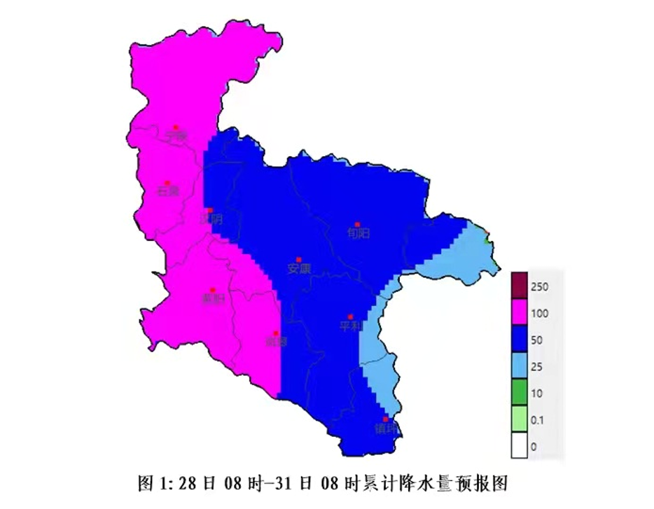 29日白天至夜間全市大雨(25~40mm),紫陽、嵐皋、漢陰、 石泉、漢濱、旬陽、平利西北部、寧陜南部大到暴雨(40~75mm) ,紫陽西部、嵐皋西部個(gè)別鎮(zhèn)村有大暴雨(100~150mm)。