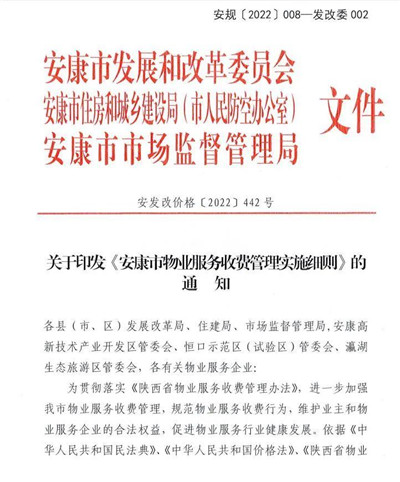為貫徹落實《陜西省物業(yè)服務(wù)收費管理辦法》,進一步加強我市物業(yè)服務(wù)收費管理,規(guī)范物業(yè)服務(wù)收費行為,維護業(yè)主和物業(yè)服務(wù)企業(yè)的合法權(quán)益,促進物業(yè)服務(wù)行業(yè)健康發(fā)展。依據(jù)《中華人民共和國民法典》、《中華人民共和國價格法》、《陜西省物業(yè)管理條例》、《陜西省定價目錄》及《陜西省物業(yè)服務(wù)收費管理辦法》等法律法規(guī), 結(jié)合我市實際,我們制定了《安康市物業(yè)服務(wù)收費管理實施細則》及中心城區(qū)物業(yè)服務(wù)收費政府指導價標準,經(jīng)市政府同意,現(xiàn)印發(fā)給你們,請遵照執(zhí)行。各縣(市、區(qū))發(fā)改部門應(yīng)會同相關(guān)部門盡快制定符合各地實際的前期物業(yè)服務(wù)收費政府指導價標準。