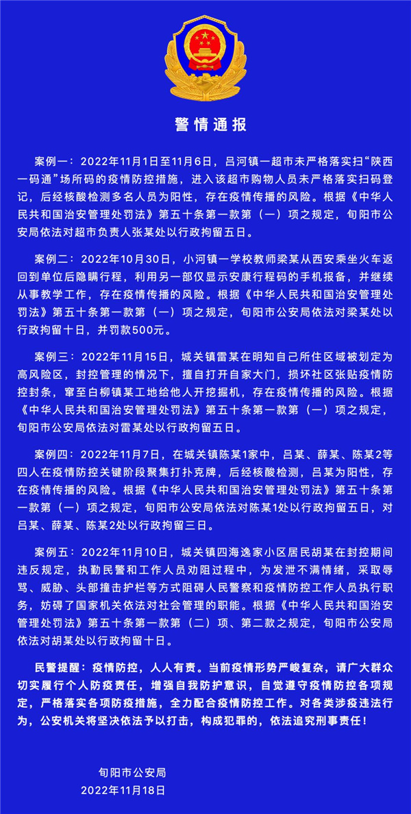 11月18日,旬陽(yáng)市通報(bào)5起涉疫違法案件,依法處理8人