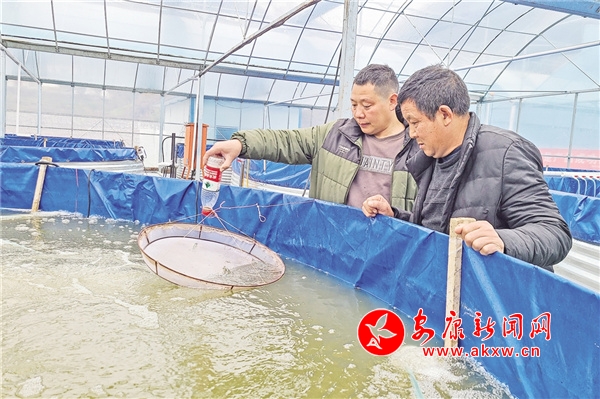 在石泉縣城關(guān)鎮(zhèn)楊柳社區(qū)高密度水產(chǎn)養(yǎng)殖基地,技術(shù)人員正在耐心查看南美對蝦生長情況。董長松 攝