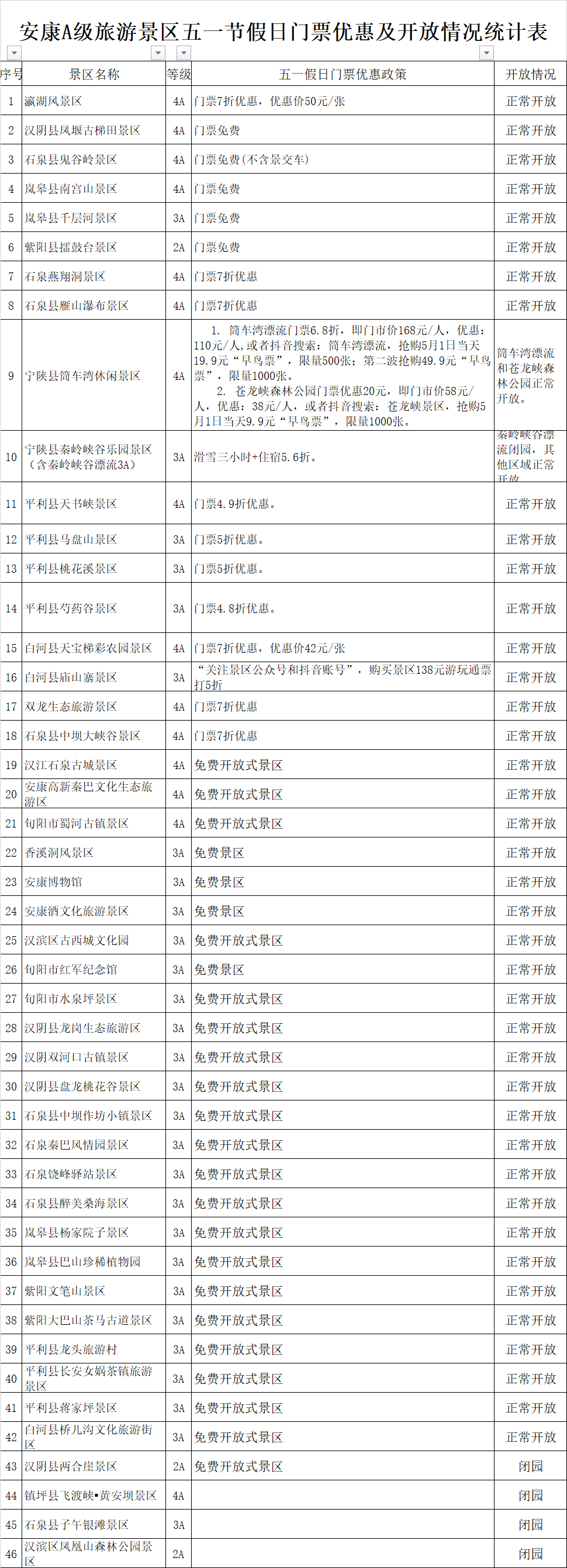 24家不收門票的開放式景區(qū)(漢江石泉古城景區(qū)、安康高新秦巴文化生態(tài)旅游區(qū)、旬陽市蜀河古鎮(zhèn)景區(qū)、香溪洞風(fēng)景區(qū)、安康博物館、安康酒文化旅游景區(qū)、漢濱區(qū)古西城文化園、旬陽市紅軍紀(jì)念館、旬陽市水泉坪景區(qū)、漢陰縣龍崗生態(tài)旅游區(qū)、漢陰雙河口古鎮(zhèn)景區(qū)、漢陰縣盤龍?zhí)一ü染皡^(qū) 、石泉縣中壩作坊小鎮(zhèn)景區(qū)、石泉秦巴風(fēng)情園景區(qū)、石泉饒峰驛站景區(qū)、石泉縣醉美桑海景區(qū)、嵐皋縣楊家院子景區(qū)、嵐皋縣巴山珍稀植物園、紫陽文筆山景區(qū)、紫陽大巴山茶馬古道景區(qū)、平利縣龍頭旅游村、平利縣長安女媧茶鎮(zhèn)旅游景區(qū)、平利縣蔣家坪景區(qū)、白河縣橋兒溝文化旅游街區(qū))。