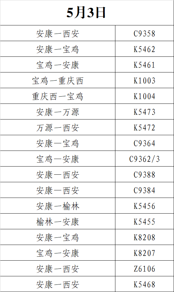 為滿足旅客返程需求,5月3日安康火車站共加開旅客列車21列。主要集中在西安、寶雞、榆林、重慶、萬(wàn)源等方向。