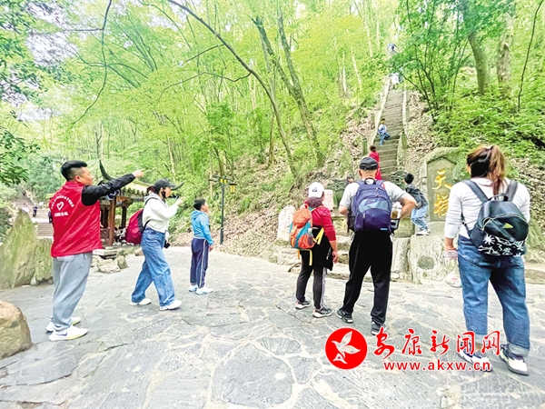 勞動(dòng)節(jié)假期,香溪洞風(fēng)景區(qū)的志愿者正在引導(dǎo)游客安全攀登天梯。 胡波 攝