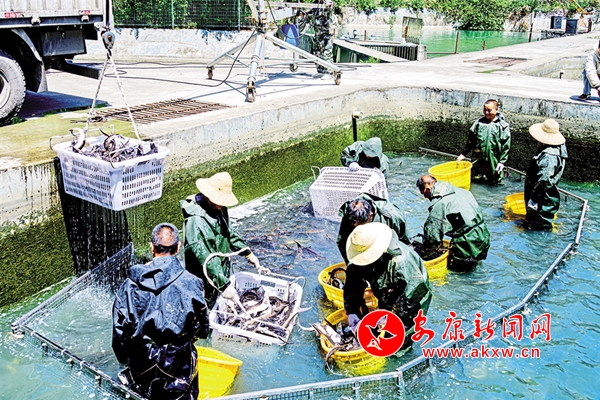 5月1日,嵐皋縣生態(tài)養(yǎng)殖基地的鱘龍魚喜獲豐收。 文彩琴 攝
