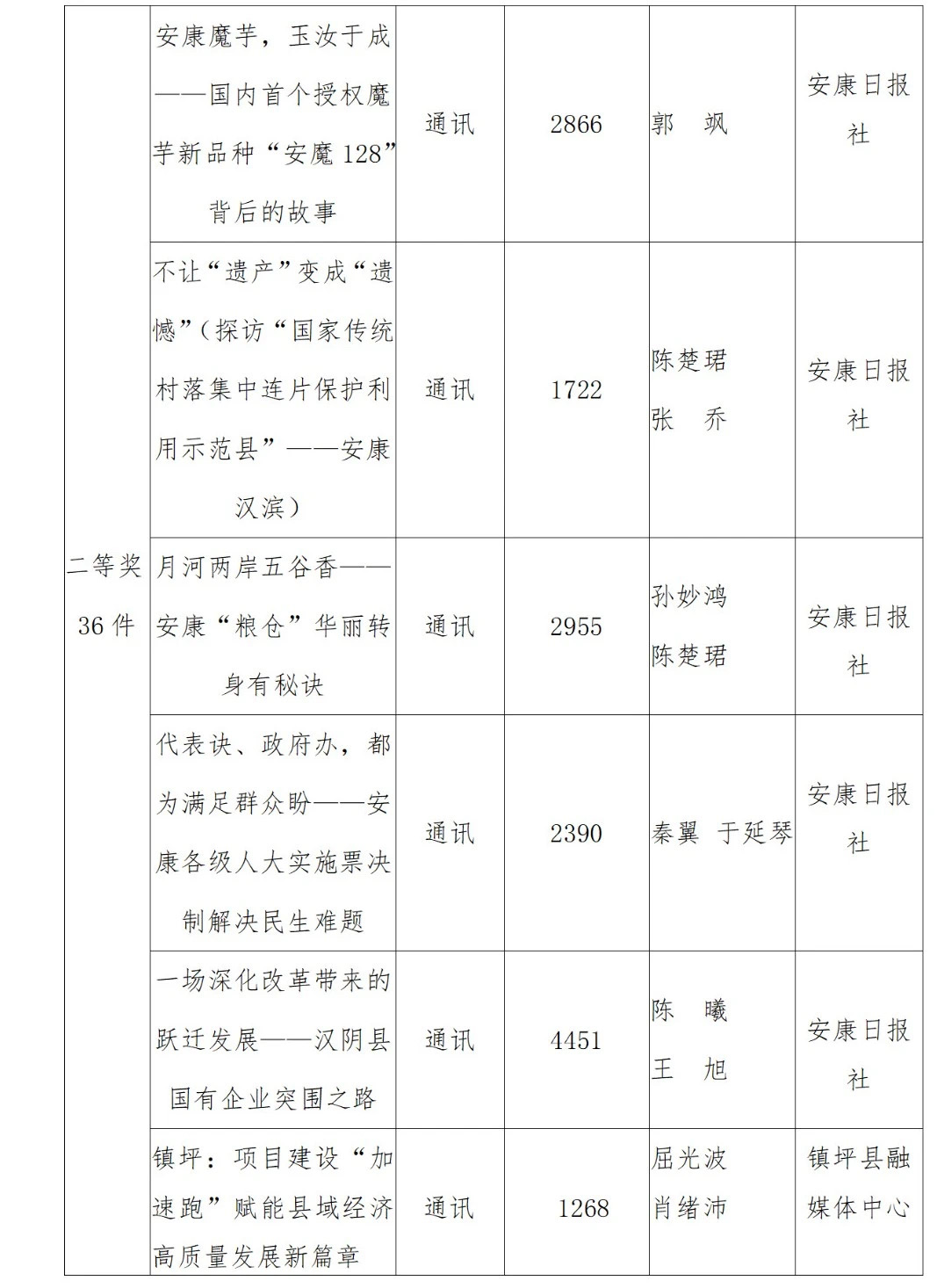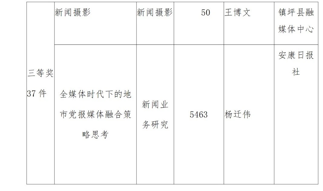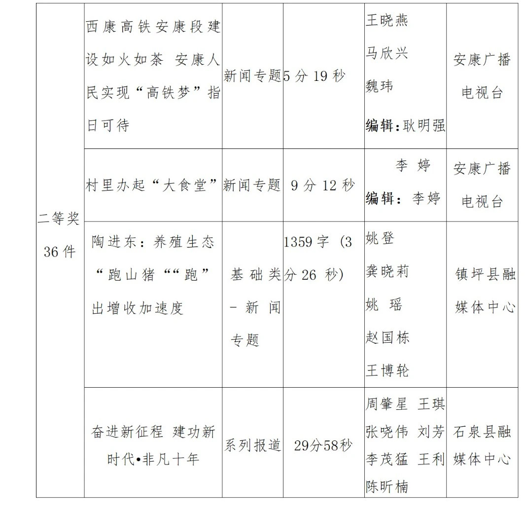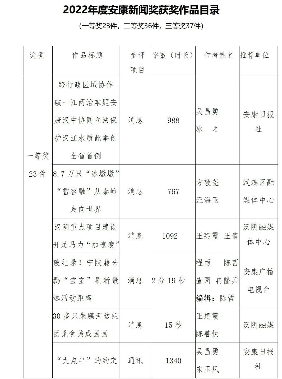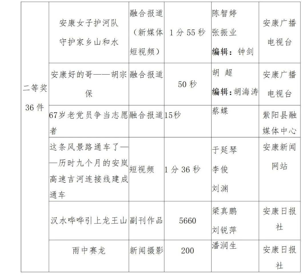 2022年度安康新聞獎(jiǎng)評(píng)審工作在中共安康市委宣傳部的指導(dǎo)下,由市記協(xié)具體組織實(shí)施,經(jīng)過各申報(bào)單位推薦、初審,市記協(xié)復(fù)審并組織專家定評(píng),評(píng)選出擬獲安康新聞獎(jiǎng)作品96件,其中一等獎(jiǎng)23件、二等獎(jiǎng)36件、三等獎(jiǎng)37件。擬授予姚登等14名同志“安康市優(yōu)秀新聞工作者”榮譽(yù)稱號(hào)。