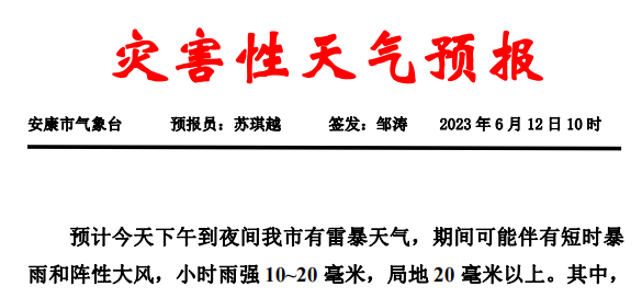 預(yù)計今天下午到夜間我市有雷暴天氣,期間可能伴有短時暴雨和陣性大風(fēng),小時雨強10~20毫米,局地20毫米以上。其中,旬陽、白河、嵐皋、平利、鎮(zhèn)坪局部可能出現(xiàn)冰雹。