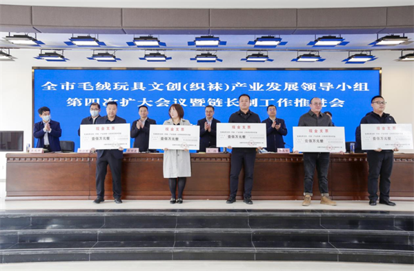 2022年10月18日,全市毛絨玩具文創(chuàng)(織襪)產(chǎn)業(yè)發(fā)展領(lǐng)導(dǎo)小組第四次擴(kuò)大會議上表彰兌現(xiàn)了一次性獎補(bǔ)資金1000萬元