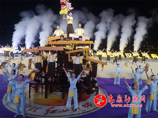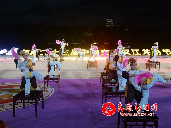 熠熠燈輝“靚”漢江,南北歌舞“響”安康。演出活動以絢麗奪目的燈光秀《華彩漢江》開場,漢江兩岸五光十色的燈光隨著音樂的節(jié)律不斷變換、舞動,使一江兩岸美輪美奐,《安安康康鬧龍舟》通過“毛絨玩具”的親切問候和載歌載舞,展現(xiàn)了安康新毛絨玩具產(chǎn)業(yè)蓬勃發(fā)展的動力和生機(jī),具有地方特色的民族舞蹈《方寸之間》,將安康的傳統(tǒng)藝術(shù)與時代特色緊密結(jié)合,舞出了了安康人民在新時代表現(xiàn)出的新風(fēng)貌,原汁原味的陜南陜北民歌對唱,讓粗狂和婉約在漢水之濱進(jìn)行完美約會,歌舞、獨(dú)唱、漢劇、雜技《南木有禾》《荷韻漢江》《節(jié)日歡歌》《魅力安康》《環(huán)之舞》《端午安康》等節(jié)目,以獨(dú)特的唱腔、曼妙的舞姿和獨(dú)特的技藝全方位的展現(xiàn)了漢水傳統(tǒng)文化的魅力和安康人民的精神追求,熱情激昂的歌舞《端午安康》演繹出了漢水兒女對聚力建設(shè)幸福安康的美好祝愿和對未來幸福美好生活的向往。