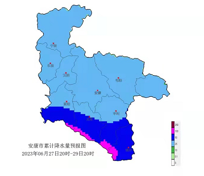 本網(wǎng)訊 6月25日17時,安康市氣象臺發(fā)布重要天氣報告:預(yù)計6月27日夜間至29日白天我市有一次較強(qiáng)降雨天氣過程。預(yù)計過程累計雨量全市大部地區(qū)30-50毫米,紫陽、嵐皋、平利、鎮(zhèn)坪50-80毫米(個別鎮(zhèn)辦超過100毫米),主要降雨時段集中在28日白天到29日上午,過程期間可能伴有短時暴雨,最大小時雨強(qiáng)可達(dá)20-40毫米。具體預(yù)報如下: