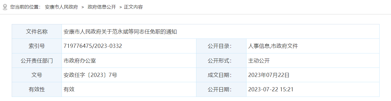 安康市人民政府關(guān)于范永斌等同志任免職的通知