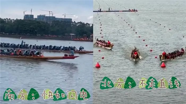 前不久的端午節(jié),關(guān)于南北方人龍舟賽的對比視頻被拉出來玩壞了。視頻中的北方龍舟代表隊(duì)看起來姿勢笨拙,頻頻翻船,網(wǎng)友調(diào)侃:紀(jì)念屈原主打一個(gè)“下水陪伴”;而畫面中的南方龍舟代表隊(duì)把龍舟玩出了花,S彎漂移、彈射起步信手拈來,主打一個(gè)同舟共濟(jì)。