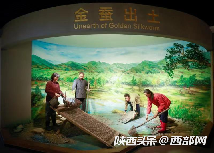 “和很多珍貴文物一樣,這條‘鎏金銅蠶’也是發(fā)現(xiàn)于不經(jīng)意間。”金蠶之鄉(xiāng)展覽館講解員向媒體采訪團(tuán)介紹了那段歷史——1984年,石泉縣池河流域譚家灣農(nóng)民譚福全,在河水中淘金時(shí),發(fā)現(xiàn)一條金光燦燦的金蠶。這只蠶通長(zhǎng)5.6厘米,胸圍1.9厘米,胸高1.8厘米,首尾9個(gè)腹節(jié),體態(tài)逼真。此種鎏金蠶是迄今國(guó)內(nèi)首次發(fā)現(xiàn)的,經(jīng)專家鑒定為國(guó)家一級(jí)文物,它是西漢時(shí)期皇帝褒獎(jiǎng)蠶桑生產(chǎn)的“御賜獎(jiǎng)品”,非常珍貴。