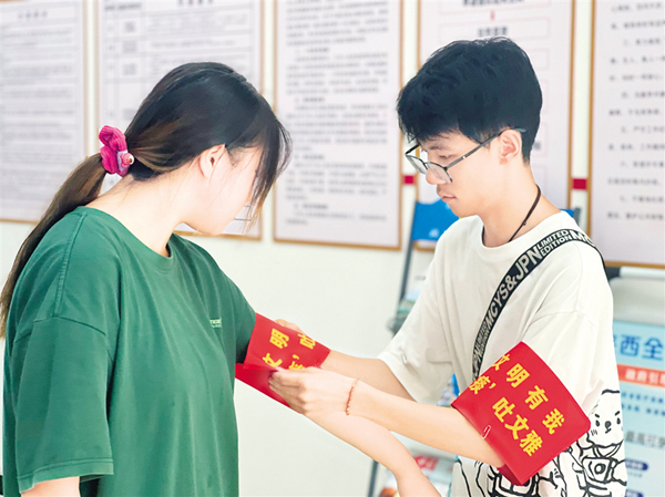 大學(xué)生志愿者王子晗手腕受傷仍然堅(jiān)持上崗。