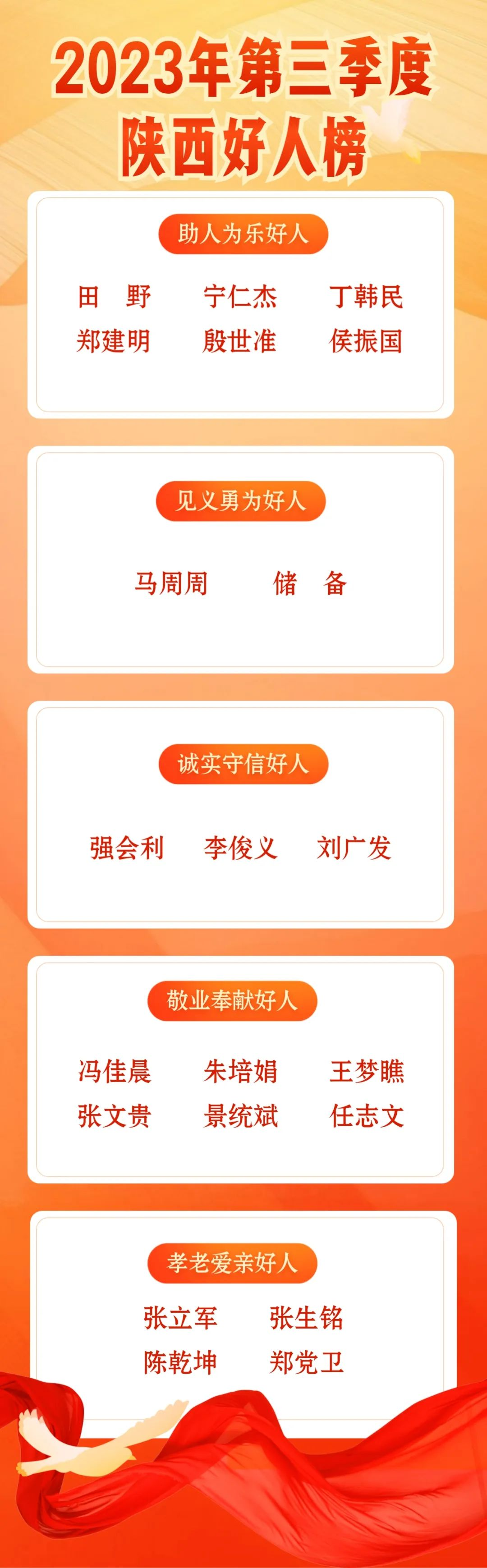 10月13日,2023年第三季度陜西好人榜發(fā)布儀式暨“奮進(jìn)新時代 聚力譜新篇”新時代文明實踐展演活動在榆林陽光廣場舉行。此次共有田野、強(qiáng)會利、馮佳晨等21名身邊好人登上第三季度“陜西好人榜”。其中,我市儲備、陳乾坤2人分別入選2023年第三季度“陜西好人榜”名單見義勇為好人、孝老愛親好人。