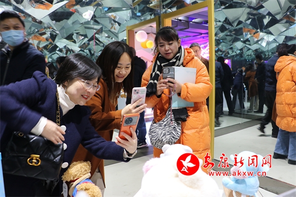學(xué)員在恒口示范區(qū)毛絨玩具文創(chuàng)“五大中心”參觀,紛紛圍住自己感興趣的毛絨玩具討論拍照。