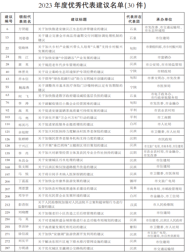 市五屆人大四次會議以來,全體市人大代表緊緊圍繞全市中心工作和人民群眾普遍關(guān)心關(guān)注的熱點難點問題,依法履行職責(zé),積極建言獻(xiàn)策,共提出了296件代表建議,這些建議主題明確具體、建議切實可行、行文簡潔規(guī)范、效果可期可見,為推進(jìn)我市經(jīng)濟社會發(fā)展和民主法治建設(shè)凝聚了智慧、增進(jìn)了共識、貢獻(xiàn)了力量。為樹立典型、推進(jìn)工作,市人大常委會決定,對方賢超等代表提出的30件優(yōu)秀代表建議予以通報表揚。