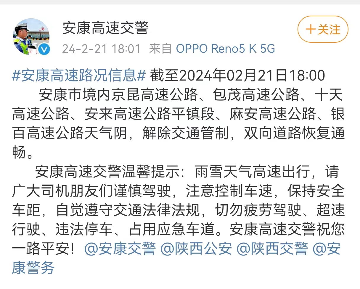 2月21日18時,安康高速交警發(fā)布消息:截至2024年02月21日18:40,安康市境內(nèi)京昆高速公路、包茂高速公路、十天高速公路、安來高速公路平鎮(zhèn)段、麻安高速公路、銀百高速公路天氣陰,解除交通管制,雙向道路恢復(fù)通暢。 禁止危化品運輸車輛和七座以上客車駛?cè)敫咚佟?span style="display:none">ric安康新聞網(wǎng)