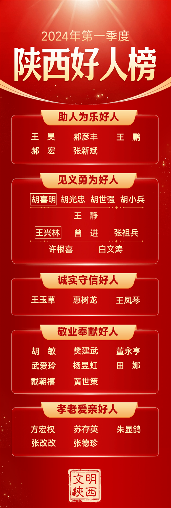 4月25日下午,2024年第一季度陜西好人榜發(fā)布儀式暨道德模范與身邊好人現(xiàn)場交流活動在西安市高陵區(qū)舉辦 。我市助人為樂好人張新斌,見義勇為好人王興林、曾進、張祖兵,誠實守信好人王鳳琴光榮上榜,一起來看看他們的光榮事跡。