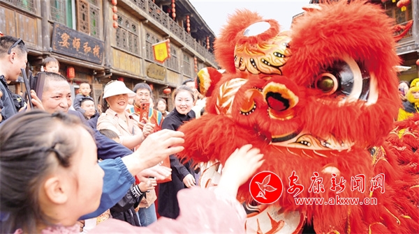 “五一”小長假期間,漢陰縣雙河口古鎮(zhèn)景區(qū)吸引了大批游客前來游玩打卡。圖為游人欣賞舞獅表演。王建霞 攝