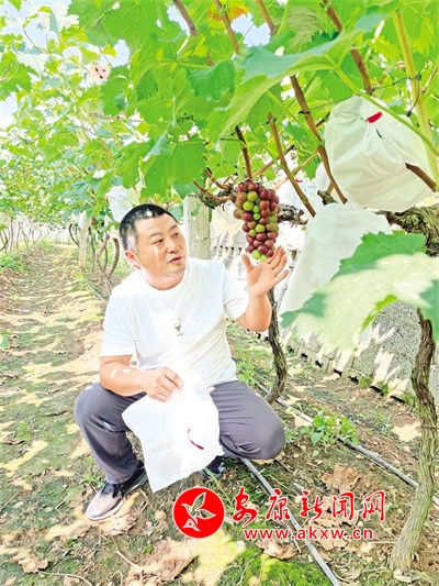 2016年,吳世銀開始嘗試在本地小范圍種植葡萄,2019年10月,在該鎮(zhèn)大力支持下開始發(fā)展山地葡萄種植,并成立家庭農(nóng)場(chǎng)。經(jīng)過(guò)8年持續(xù)發(fā)展,他的基地從最開始只有一個(gè)夏黑品種發(fā)展至現(xiàn)在5個(gè)品種,目前種植規(guī)模40余畝,年產(chǎn)值達(dá)60萬(wàn)元。