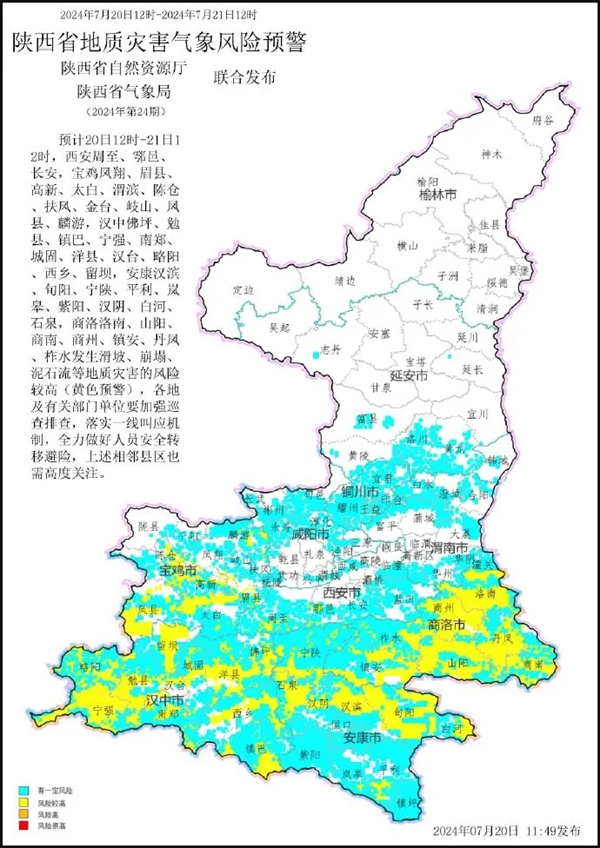陜西省自然資源廳與省氣象局聯(lián)合發(fā)布地質(zhì)災(zāi)害氣象風(fēng)險(xiǎn)黃色預(yù)警,預(yù)計(jì)7月20日12時(shí)至7月21日12時(shí),下圖所示縣(區(qū))可能發(fā)生地質(zhì)災(zāi)害:其中我市漢濱、旬陽(yáng)、寧陜、平利、嵐皋、紫陽(yáng)、漢陰、白河、石泉發(fā)生滑坡、崩塌、泥石流等地質(zhì)災(zāi)害的風(fēng)險(xiǎn)較高(黃色預(yù)警),各地及有關(guān)部門單位要加強(qiáng)巡查排查,落實(shí)一線叫應(yīng)機(jī)制,全力做好人員安全轉(zhuǎn)移避險(xiǎn),上述相鄰縣區(qū)也需高度關(guān)注。