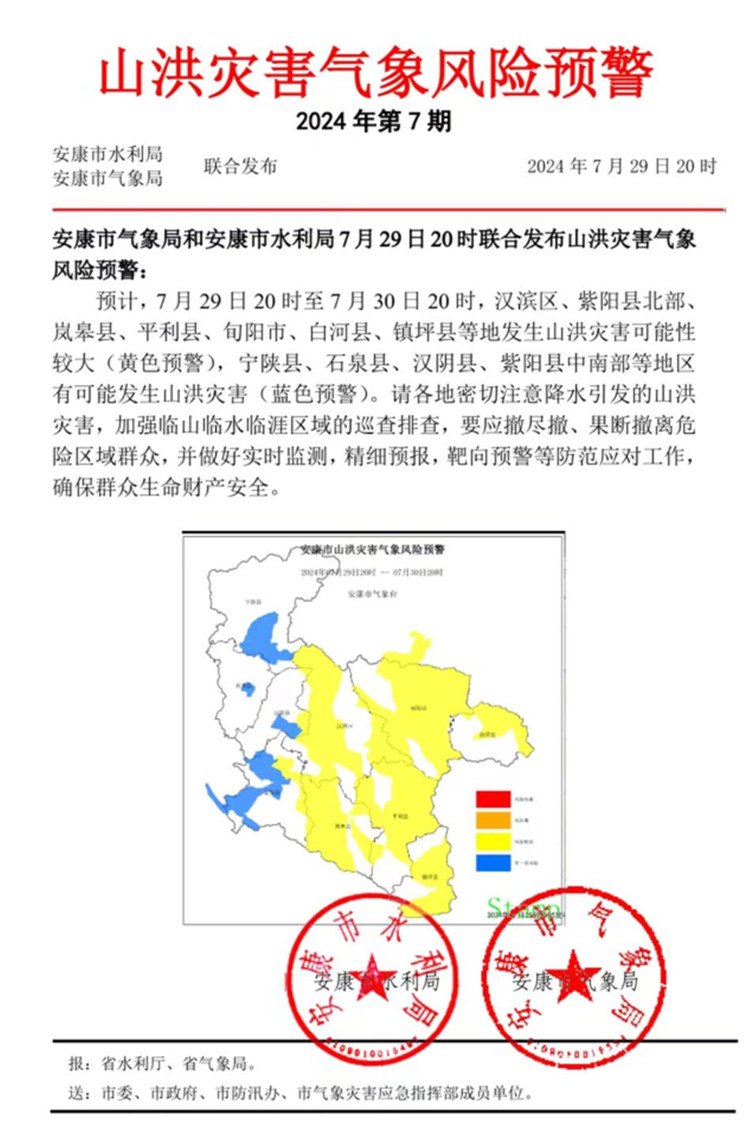 安康市氣象局和安康市水利局7月29日20時(shí)聯(lián)合發(fā)布山洪災(zāi)害氣象風(fēng)險(xiǎn)預(yù)警:預(yù)計(jì)7月29日20時(shí)至7月30日20時(shí),漢濱區(qū)、紫陽縣北部嵐泉縣、平利縣、旬陽市、白河縣、鎮(zhèn)坪縣等地發(fā)生山洪災(zāi)害可能性較大(黃色預(yù)警),寧陜縣、石泉縣、漢陰縣、紫陽縣中南部等地區(qū)有可能發(fā)生山洪災(zāi)害(藍(lán)色預(yù)警)。
