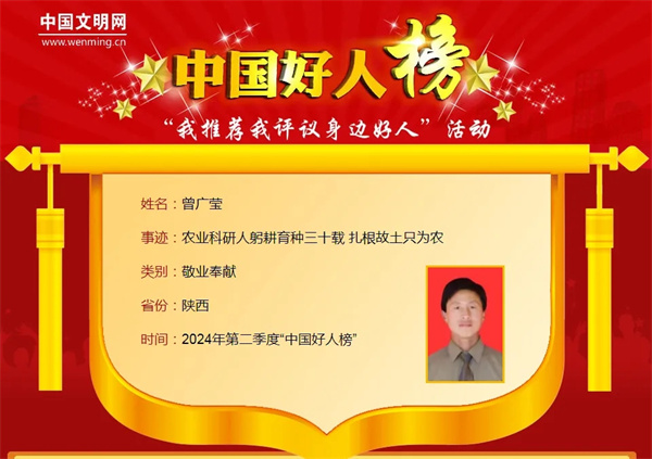曾廣瑩,男,1966年10月生,中共黨員,陜西省鎮(zhèn)坪縣農(nóng)業(yè)科學(xué)研究所黨支部書記、副所長。曾廣瑩30年如一日行走于田間地頭,兢兢業(yè)業(yè)從事農(nóng)業(yè)示范研究和推廣工作,完成多個玉米新品種審定與大面積推廣,填補了中高山玉米品種空白,為秦巴地區(qū)糧食安全和玉米品種繁育作出了突出貢獻(xiàn)。曾廣瑩曾獲“農(nóng)業(yè)部全國農(nóng)牧漁業(yè)豐收獎(農(nóng)業(yè)技術(shù)推廣貢獻(xiàn)獎)”“陜西省優(yōu)秀共產(chǎn)黨員”“陜西好人”等榮譽。