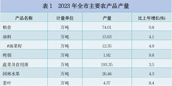2023年,全市農(nóng)林牧漁業(yè)增加值增長(zhǎng)3.9%。其中,農(nóng)業(yè)增加值增長(zhǎng)4.2%;林業(yè)增加值增長(zhǎng)2.4%;牧業(yè)增加值增長(zhǎng)2.2%;漁業(yè)增加值增長(zhǎng)8.3%;農(nóng)林牧漁專(zhuān)業(yè)及輔助性活動(dòng)增加值增長(zhǎng)6.4%。
