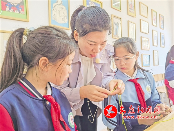 倉上鎮(zhèn)中心小學(xué)編織社團老師在教授編織技巧